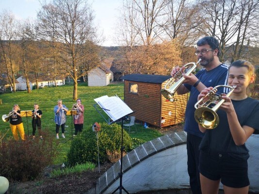 Allerdings begann nur kurz danach die große Corona Krise und wir durften uns nicht mehr zu den Proben im Gemeindehaus treffen. Also mussten wir nun allein zu Hause üben. Doch das gemeinsame Spielen fehlte uns sehr. Im Internet fanden wir einen Aufruf. Alle Musiker/Innen wurden dazu aufgerufen, aus dem Fenster oder vom Balkon zu spielen. Wir waren von der Idee begeistert und sprachen uns per Whatsapp ab. Schnell einigten wir uns auf ein Datum und einige Stücke die wir Spielen wollten. Darunter waren „Guten Abend, Gut Nacht“, „Der Mond ist aufgegangen“, „Ode an die Freude“ und einige weitere Stücke. Leider konnte nicht der ganze Bläserkreis mitspielen, aber mit der Nachbarschaft bestehend aus Lotte und Anke Pies, Ina Matschke, Carola Nies und uns hatten wir eine super Truppe zusammen.